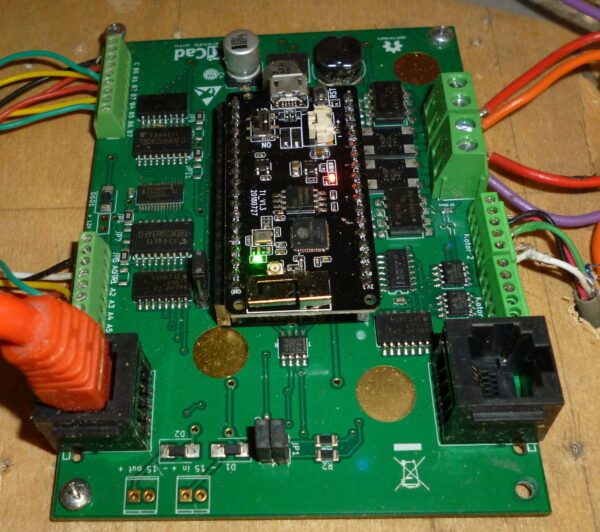 These LCC node boards feature two stall motor drivers with point sense, two opto-isolator occupancy detectors and 16 PWM LED drivers for signal lamps. These boards have all of the SMD components factory soldered on. They just need a handful of through-hole parts soldered on: terminals, headers, and connectors. The kits include the board, the through-hole parts, a Lily-Go TTGO-T1, a thumb drive with the software for the TTGO-T1 (needs to be compiled with the Arduino IDE), and a 40+ page booklet with building and configuration instructions.